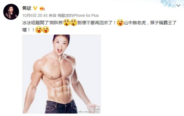 范冰冰减肥成功惹来不少人的艳羡。蒋欣昨日更是发微博称与范冰冰割袍子断袖:“冰冰姐离开了微胖界,那就不要再回来了。山中无老虎,猴子称霸王喽。”曝光20明星大尺度床戏 真实堪比不雅视频图