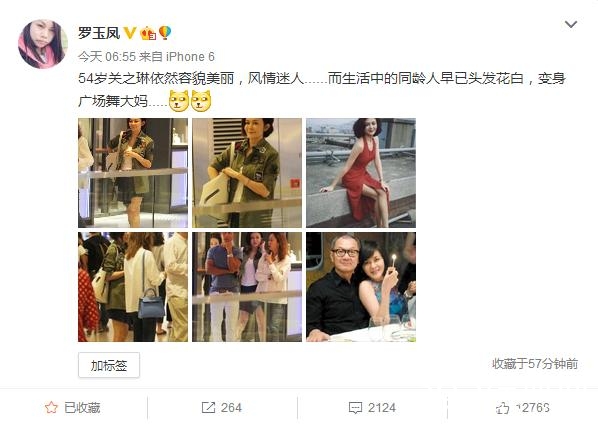 今日罗玉凤机场偶遇关之琳,并发微博称:54岁关之琳依然容貌美丽,风情迷人......而生活中的同龄人早已头发花白,变身广场舞大妈....