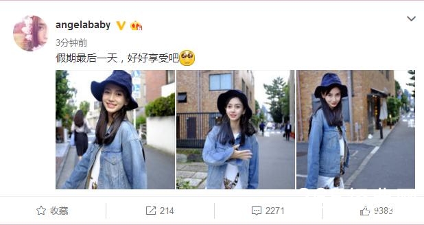 今天下午,Angelababy更新微博:假期的最后一天,好好享受吧!