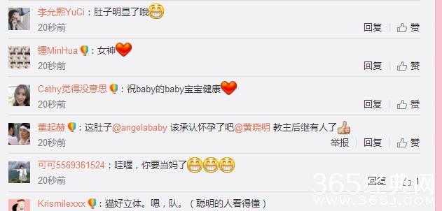 网友纷纷表示:“肚子明显了哦”,“女神”,“祝baby的baby健康”,“这肚子,该承认怀孕了吧,教主后继有人了”,“哇偶,要当妈了”,"猫好立体,嗯对,聪明的人看得懂“!