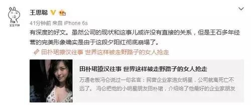 2016年7月4日,王石和宝能系的斗争正处于白热化的战况,一篇《田朴珺撩汉往事,世界就这样被走野路子的女人抢走》横空出世,文章称田朴珺做的地产生意与万科有关,意指其从事关联交易、甚至涉嫌违法犯罪,而“王石今日之困局,很大程度上受到了这段关系的拖累”,“王石多年积累的商誉,也在田小姐长时间的自我炒作中消耗殆尽”。曝光20明星大尺度床戏 真实堪比不雅视频图