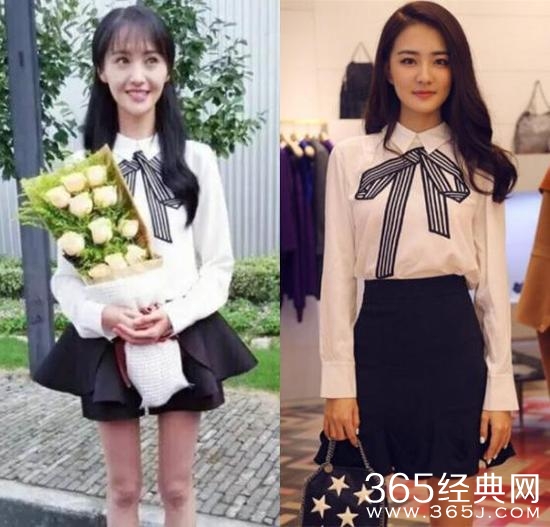 同样的蝴蝶结衬衫,郑爽搭黑色裙裤,徐璐搭黑色半身裙黁,很明显徐璐赢了,因为郑爽腿太瘦了,这样穿短裤裙,然后露出纤细的腿,完败了。