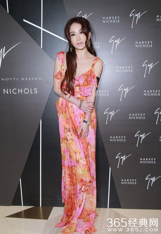 温碧霞身穿几何图案前短后长吊带裙,胸衣微露小秀乳沟,撩发显性感风情。