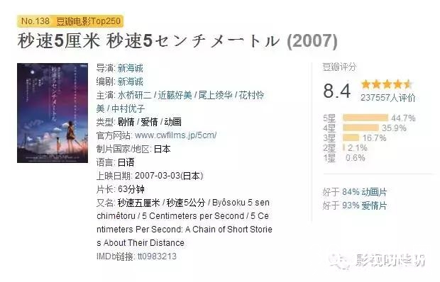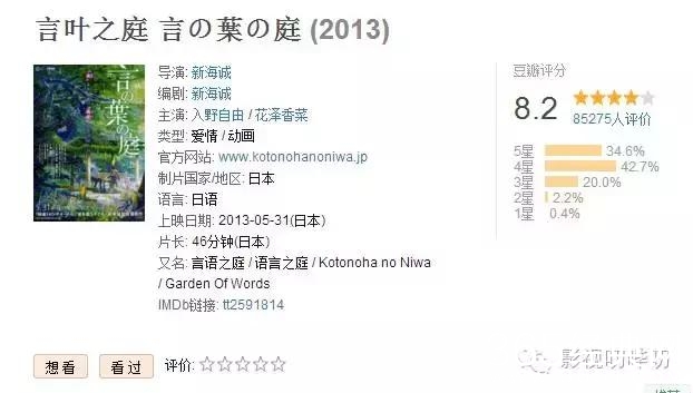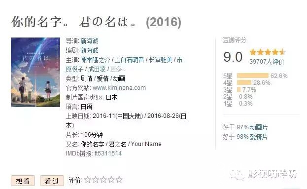 新海诚的作品在国内的口碑一直还算不错,《秒速5厘米》在豆瓣的评分是8.4,《言叶之庭》是8.2···《你的名字》是9.0。