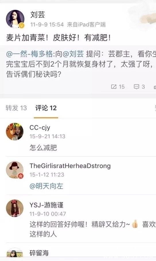 刘芸是孕妈里身材恢复比较快的一个,她的食谱很简单:麦片加青菜