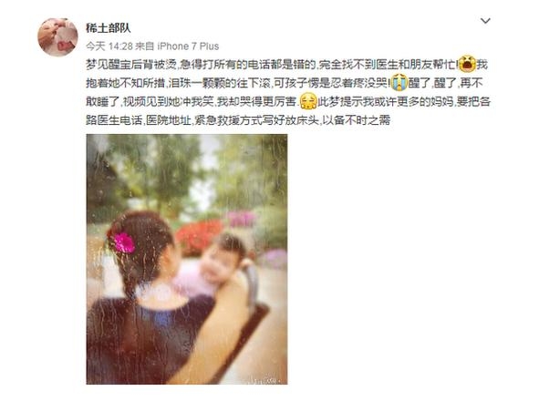 10月6日章子怡微博晒出一张抱着女儿的合影,称梦到女儿后背被烫,却找不到人帮忙,梦中泪流满面,醒来看到醒醒对着自己笑,哭得更厉害了,并善意提醒更多妈妈,把医生医院等信息放在床头。