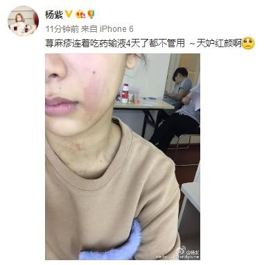 杨紫此前不知道怎么感染了荨麻疹,先还只是胳膊,本来以为这都好了,没想到早上爆出的一张照片看,越来越严重了,连着吃药输液4天了都不管用,更是蔓延到脖子和脸上,简直堪比毁容了。