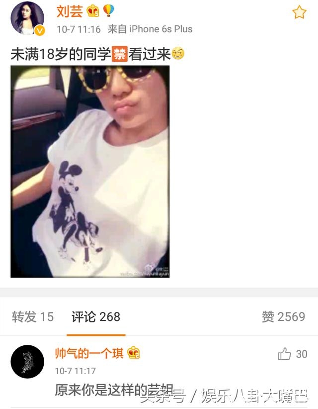 刘芸在微博喊话网友:未满18岁的同学禁看过来。(坏笑脸)