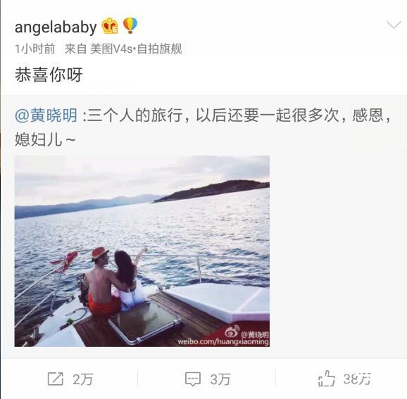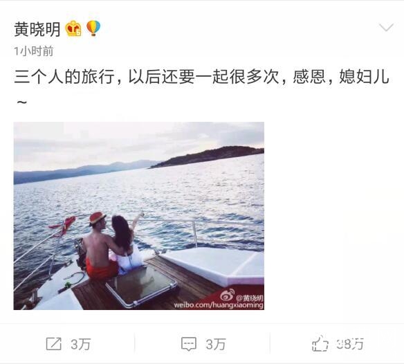 黄晓明终于憋不住了,8号晚上在微博写到“三个人的旅行,以后还要一起很多次,感恩,媳妇儿~”并晒出了和老婆 angelababy坐在游艇上的照片。