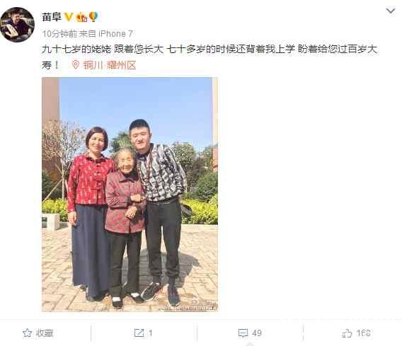 ”照片中,苗阜和姥姥、妈妈同框,由于苗阜妈妈比较年轻,加之苗阜又长得比较着急,有网友问苗阜,“旁边的可是你媳妇”,苗阜解释,其实是他的母亲。