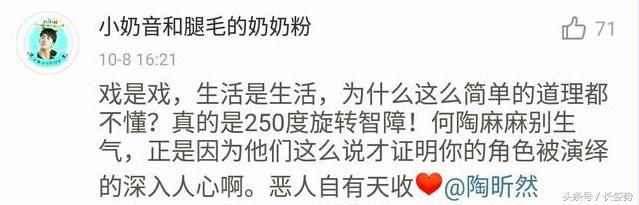 陶昕然不就演了个反角色,人家演戏演的很好,却遭到一些傻B脑残网友的诅咒谩骂!拜托戏里戏外你自己分不清就不要像疯狗一样乱开口咬人!