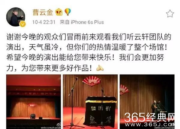 前日深夜,曹云金发出北京听云轩相声大会现场截图,图中演出台“听云轩”三个大字,场内座无虚席,演出结束所有演员集体鞠躬谢幕。