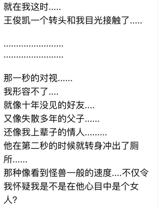 于是,在电闪火花的一瞬间,王俊凯一个转头和薛之谦目光接触了.....但,童话里故事里都是骗人的,王俊凯并没有爱上薛之谦,而是以风一般的速度跑出了厕所......