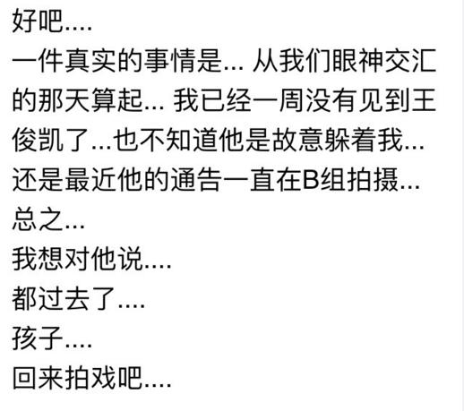 事情的结局是:从王俊凯在厕所和薛之谦眼神交汇的那天起,薛之谦已经一周没有见到王俊凯了,于是,大度的薛之谦向王俊凯喊话:都过去了...孩子...回来拍戏吧!