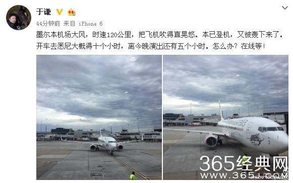 今天相声演员于谦在微博发文称:墨尔本机场大风,时速120公里,把飞机吹得直晃悠,本已登机,又被轰下来了。开车去悉尼大概得十个小时,离今晚演出还有五个小时。怎么办?在线等!