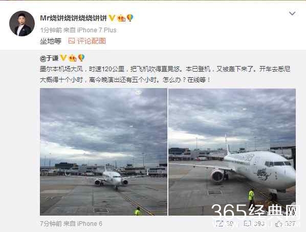 10月9日,于谦在微博称,因为风大,登上飞机却被轰下来了,附文称:“墨尔本机场大风,时速120公里,把飞机吹得直晃悠。本已登机,又被轰下来了。开车去悉尼大概得十个小时,离今晚演出还有五个小时。怎么办?在线等!”