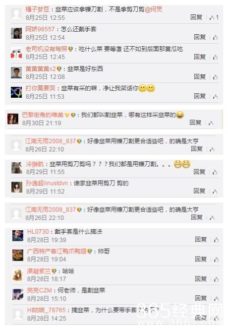 原来是王中磊摘韭菜的方法错误了,所有的人纷纷在留言区说:韭菜不是用镰刀割的么?第一次看见有人用剪刀,还手套!