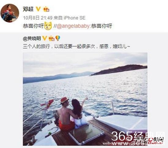 昨日正值黄晓明与baby举办婚礼一周年纪念日,黄晓明在微博公开老婆angelababy怀孕的喜讯,疑似朋友圈示爱baby的截图也被曝光。截图中,黄晓明除了上传baby美照和恩爱照外,还更写道:“何德何能可以拥有你,感恩媳妇儿!”疑似baby恩爱回应:“恭喜你啊,老来得子!”引来一众娱乐圈好友转发祝福,邓超更是第一时间发挥逗比本质“恭喜侄女”。