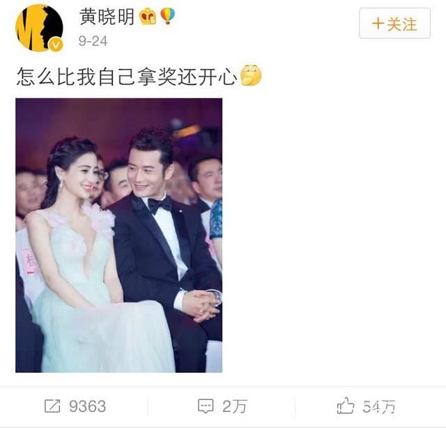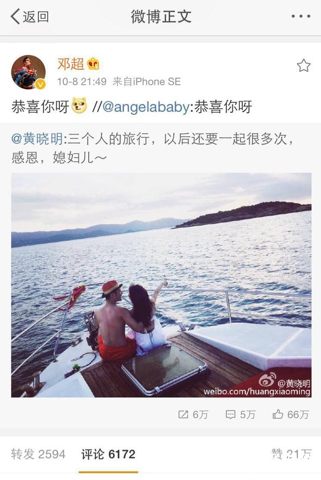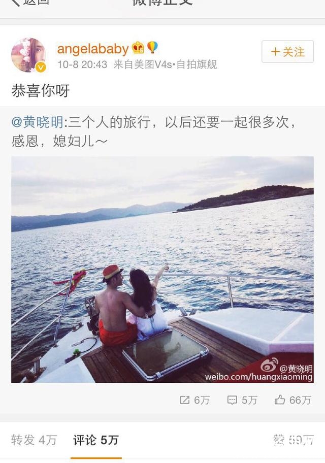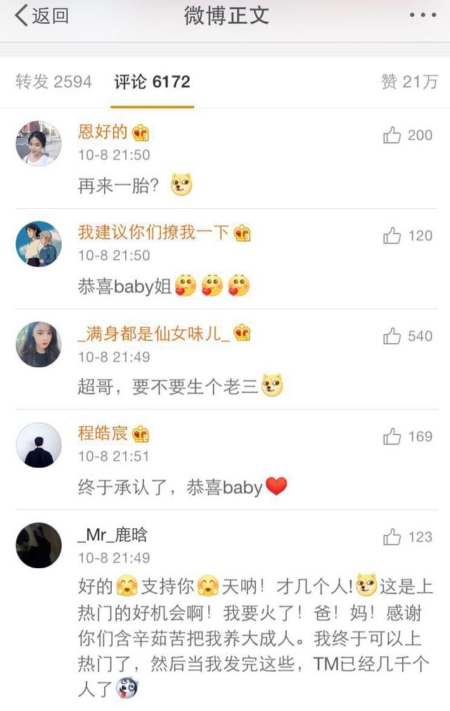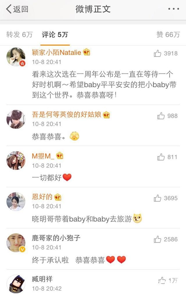 黄晓明公开baby怀孕后圈内好友则是纷纷都送上了祝福,然而baby也转发了老公黄晓明的微博并发文:“恭喜你呀”。