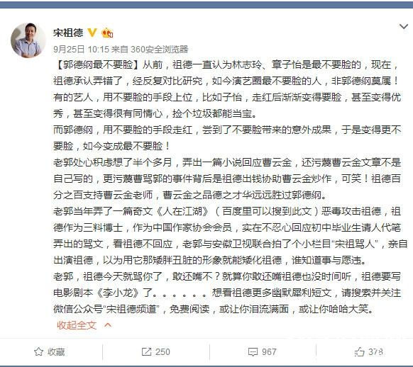 不过看着如今又想火一把的宋祖德靠着这种方式蹭热度,真的替他觉得挺悲哀的。不过都这么大岁数了依然壮心不已,我还是有点佩服他的。