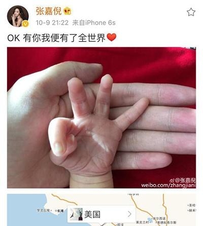 10月9日晚,张嘉倪通过微博晒大手小手照,并写道:“OK 有你我便有了全世界。”照片中,一只可爱的粉嫩小手作出“OK”的手势,放在大手的手心,十分的温馨可爱。