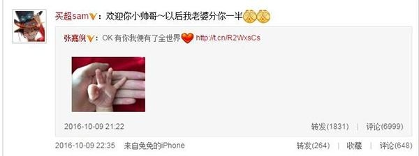 随后,张嘉倪男友买超转发此微博,并宣布生的是儿子,他幸福地写道:“欢迎你小帅哥,以后我老婆分你一半。”