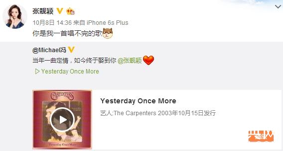10月8日,张靓颖和冯轲的婚讯被媒体曝光,婚礼将于下个月在意大利举行。两人发微博秀恩爱,甜得让人差点长蛀牙。