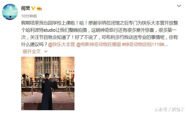 何炅:假期结束我也回学校上课啦!哈!感谢华纳在闭馆之后专门为快乐大本营开放整个哈利波特studio让我们整晚拍摄,这趟神奇旅行还有很多意外惊喜,很多第一次,关注节目就会知道了!好了不说了,邓布利多约我谈选专业的事情呢,你有什么建议吗?