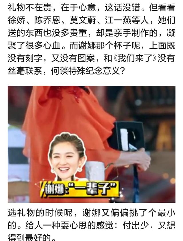 最近小编看到一篇文章很是气愤~文章说的是在《我们来了》的互送礼物环节中谢娜送了别人一个杯子,却收获了别人贵重的礼物,说谢娜小气抠门,有心机~
