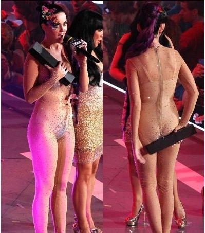 加拿大“2012 MuchMusic音乐颁奖礼”现场,凯蒂·佩里献唱新曲《Wide Awake》时,变身大蝴蝶,舞台效果非常惊艳。为了达到效果而身穿肉色透视紧身衣的她看似全裸,从照片中我们可以看到凯蒂·佩里对这套衣服并不喜欢,前挡后捂很不自然。