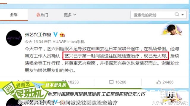 张艺兴因睡眠不足机场晕倒 工作室回应现已无大碍↓↓↓