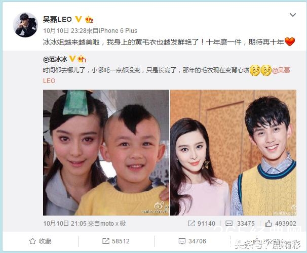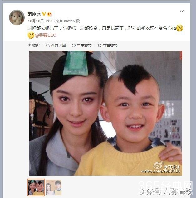 范冰冰微博原文:时间都去哪儿了,小哪吒一点都没变,只是长高了,那年的毛衣现在变背心啦