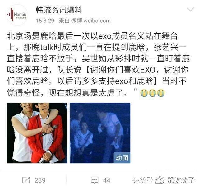 鹿晗要回国的事情,队内的成员都是知道的。鹿晗在EXO组合中的最后一场演出就是二巡时北京场的演出,那场演唱会张艺兴很反常,全程超黏鹿晗,后来鹿晗解约了大家才知道,张艺兴那么反常的原因,那可能是他最后一次和鹿晗同台!