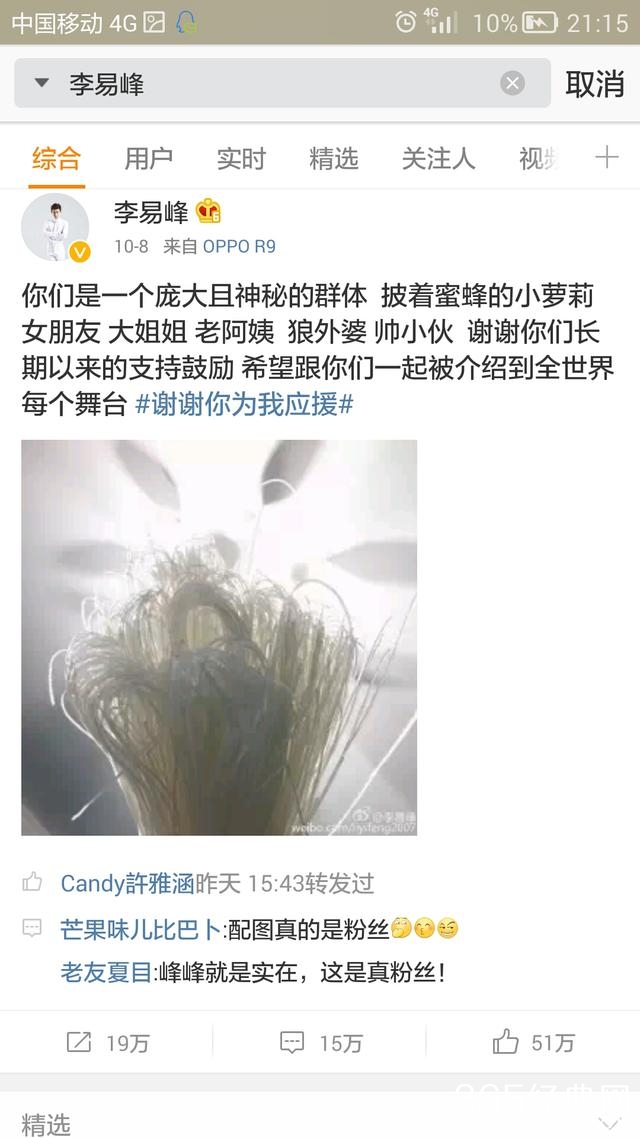 大概原微博文字是这样的:“你们是一个庞大且神秘的群体,披着蜜蜂的小萝莉 女朋友 大姐姐 老阿姨 狼外婆 帅小伙 谢谢你们 长期以来的支持鼓励 希望你们一起被介绍到全世界每个舞台”