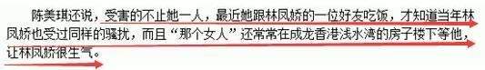 后来陈美琪就用“那个女人”来形容关之琳。陈美琪说,当时受到伤害的不止她,她跟林凤娇的一位好友吃饭时,才得知当年林凤娇也遭到过同样骚扰,那个女人还常常在成龙的房子楼下等他,直指关之琳。