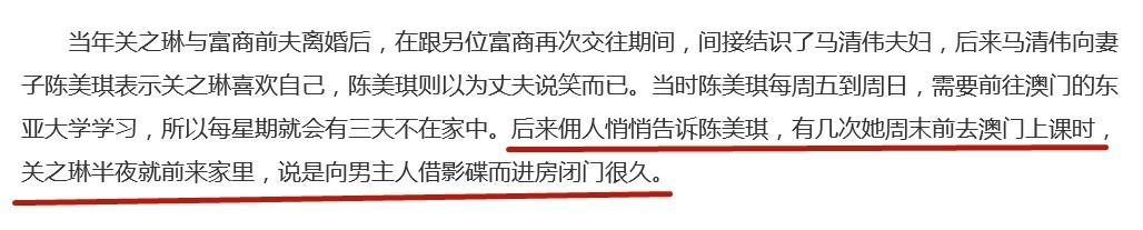 据说,马伟清是在一次聚会上认识了刚跟前夫离婚的关之琳,随后展开狂热追求。那时陈美琪在攻读硕士课程,一个月里有小半个月得住澳门。于是给了马伟清花心的机会,后来帮佣告诉陈美琪,有几次她去了澳门上课,关之琳就以借碟之名而来。