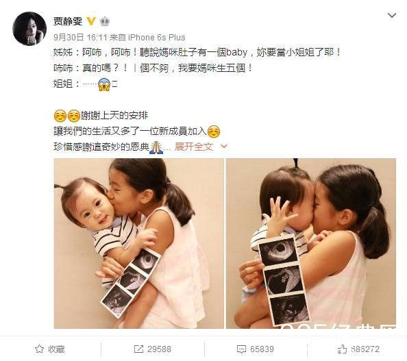 相比baby的“刻意隐瞒”,贾静雯在九月底时就微博大方公布自己喜得第三胎千金