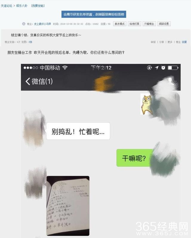 此前有网友在某论坛爆料芒果员工泄露金鹰视后获奖名单,还发了圈出刘涛、汤晶媚作品的图,疑似证明金鹰视后在两人中选出。