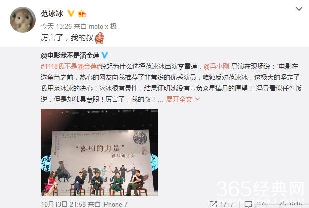 “厉害了,我叔!”冰冰你也这么俏皮?不过确实,冯导选人还是有一套,不管之前有多少网友不看好冰冰,称其为花瓶,冯导都坚持用范冰冰!
