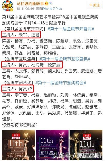第十一届中国金鹰电视艺术节互联盛典将于10月15日晚19点30分在长沙华丽开启。据悉,除了有空前强大的明星阵容外,主持阵容也颇受期待,最后定下何炅、杜海涛和沈梦辰的强大主持阵容。
