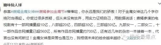 金鹰女神一敲定唐嫣,其粉丝便狂刷数据:多部剧女一啦、收视靠前啦、播放量几亿啦↓
