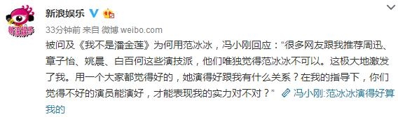 来自新浪娱乐消息称,被问及《我不是潘金莲》为何用范冰冰,冯小刚回应:“很多网友跟我推荐周迅、章子怡、姚晨、白百何这些演技派,他们唯独觉得范冰冰不可以。这极大地激发了我。用一个大家都觉得好的,她演得好跟我有什么关系?在我的指导下,你们觉得不好的演员能演好,才能表现我的实力对不对?”