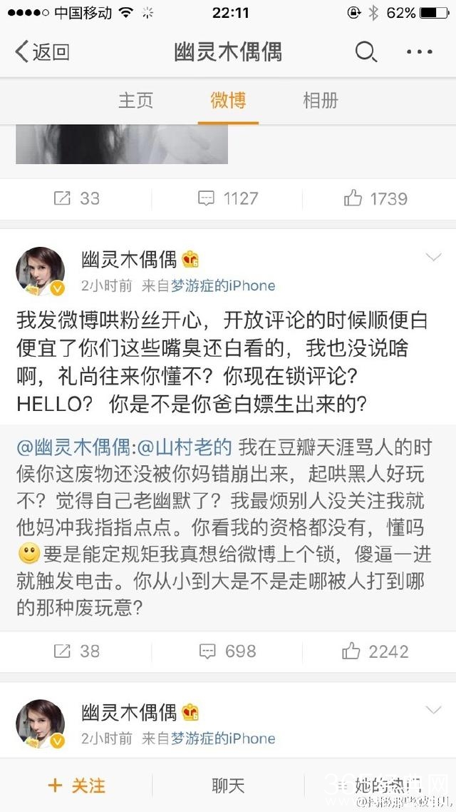 事因:沉珂发了一个视频被网友喷了。自从公开亮相后,沉珂被讽没有以前好看,也不是第一次了。这次估计也是忍够了,她连续发了几条微博骂网友,并发了网友的照片讽刺网友丑,丑得连看自己的资格都没有,你们怎么看?