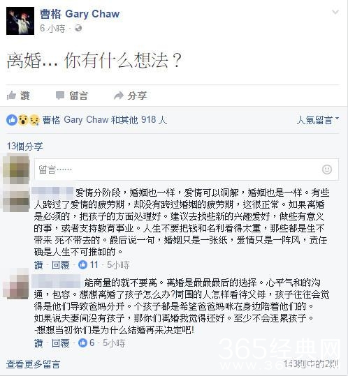 曹格14日凌晨突然在脸书上提问:离婚…你有什么想法?一句话引起许多猜测,虽然网友纷纷给出自己的意见,但还是有不少忠实粉丝惊讶地认为是他有了离婚想法,直叫他再想想,过没多久,他就转发自己的贴文,解释自己和老婆没有问题,我和我老婆不愿意...我们希望爱人继续加油,过了4分钟,他又再澄清我们很好...希望大家好......不要放弃。