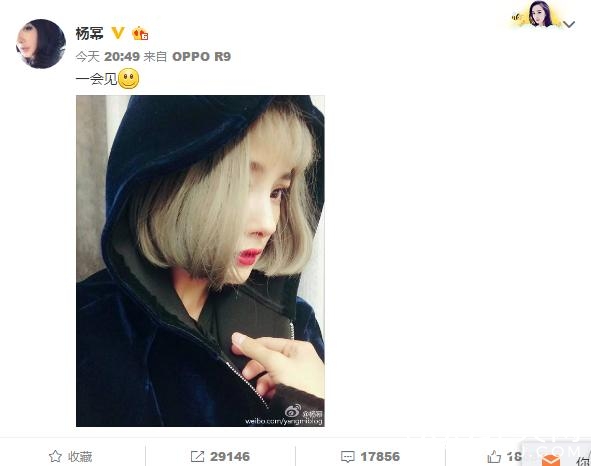 一打开看到这条,愣了好久才发现是杨幂。这奶奶灰色的头发,这连帽卫衣,这简直是十几岁的女高中生有没有?