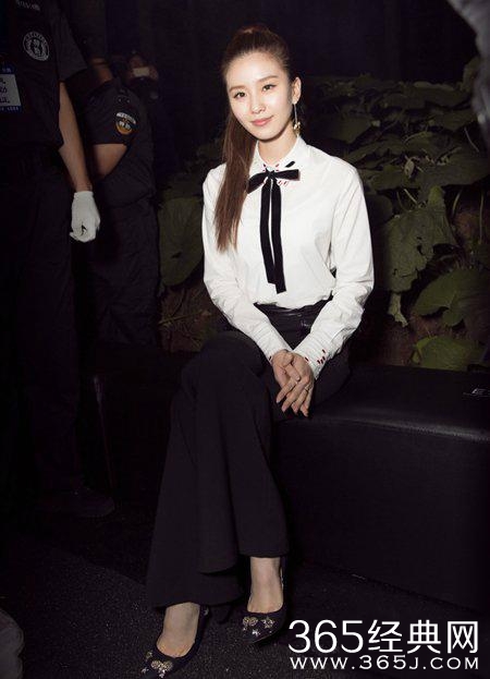 白衬衫搭配黑色阔腿西裤,很知性干练,黑色的小领结又带了点文艺小清新,高马尾很有时尚女王范,这造型出席时装周低调中又不失大气。