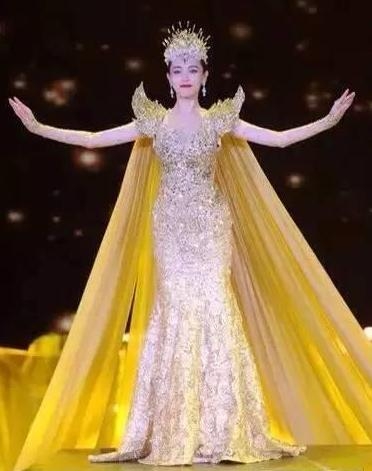 唐嫣肩部翅膀造型配合超大拖摆的金色礼服霸气十足。