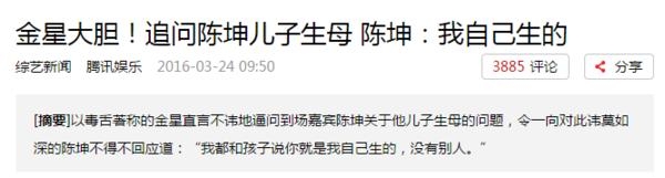 今年上半年,陈坤做客《金星秀》,提到孩子的话题,犀利的金星问道:“儿子会不会问呢?我妈是谁呢?”陈坤说:“你说过不问这种严肃的问题。”金星化解尴尬称:“我只是想知道你面对这种问题的时候以什么样的智商去应对。”陈坤直言,他会告诉儿子:“你没有,你只有我!”