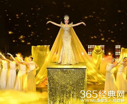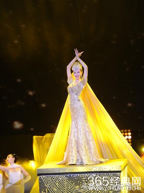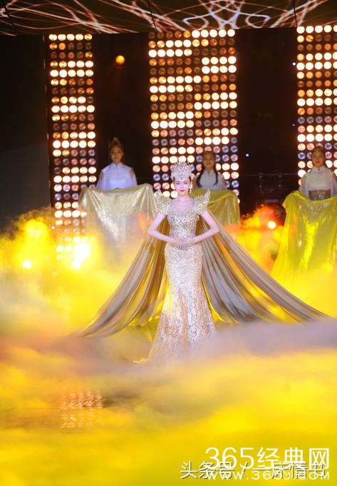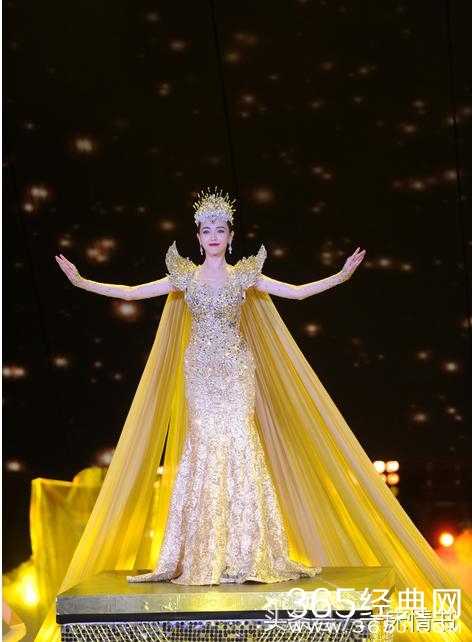 伴随着璀璨的灯光,头戴耀眼皇冠、身穿金色拖地礼服的唐嫣华丽登场,优雅纯美,笑容甜美,惊艳之极。