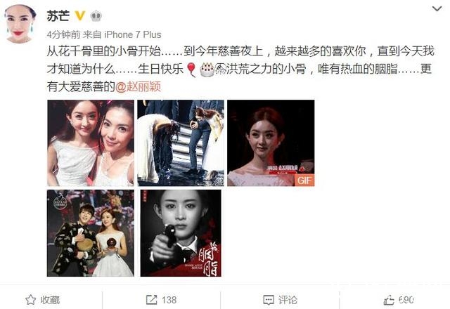 苏芒半夜晒照说:从花千骨里的小骨开始……到今年慈善夜上,越来越多的喜欢你,直到今天我才知道为什么……生日快乐。洪荒之力的小骨,唯有热血的胭脂……更有大爱慈善的赵丽颖。曝光20明星大尺度床戏 真实堪比不雅视频图